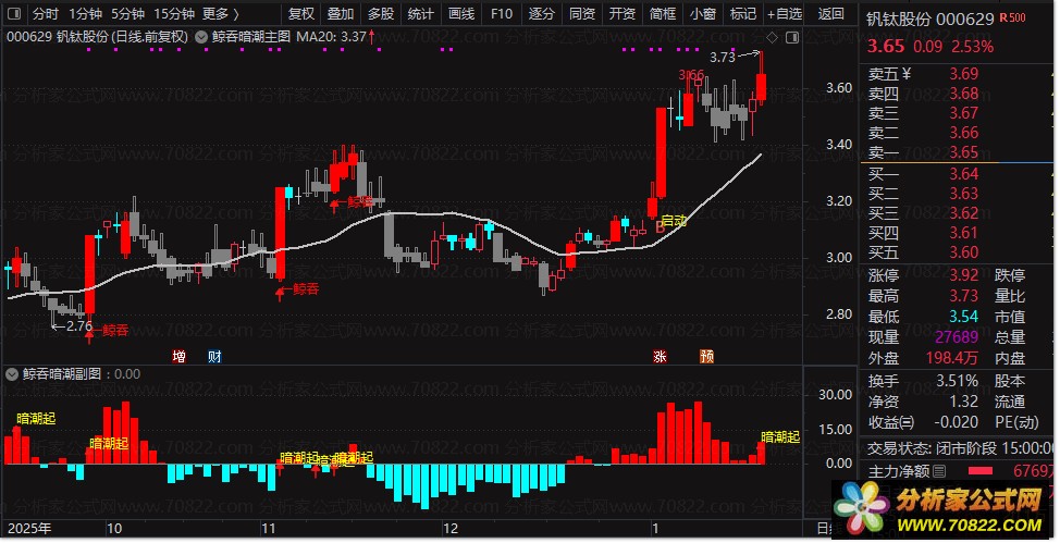 在主升浪启动前,股价常经历一段波动极度收敛的“静默期”,布林带收口、振幅缩小。鲸吞暗潮指标会重点监控此类“波动窒息”阶段,捕捉主力低位吸筹的蛛丝马迹。