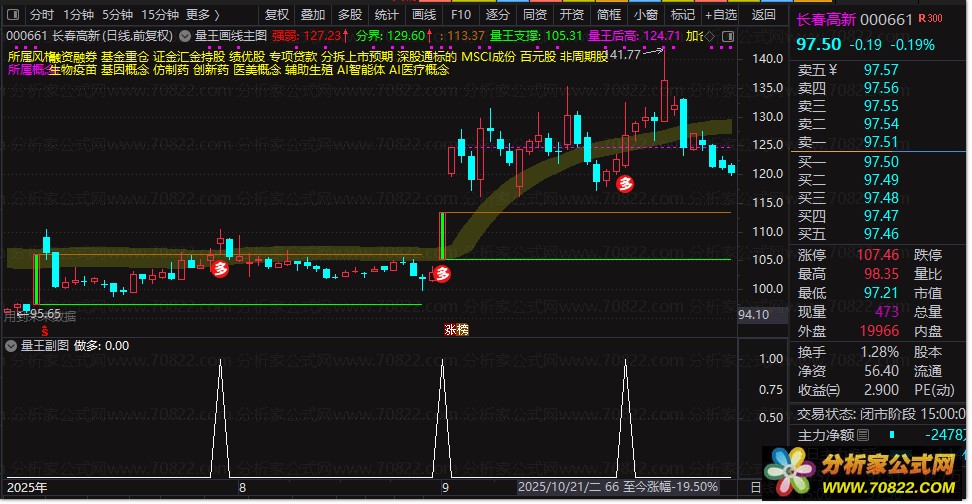 量王后划线(量王后高):量王信号出现次日若呈现高量,大概率为短期阶段性顶部的技术参考信号,除非当日出现反包走势扭转量价格局;个股若要实现有效强势突破,需向上突破该量王后划线,方可作为趋势延续的技术佐证。