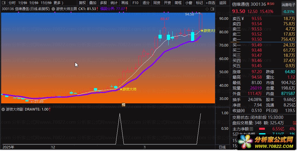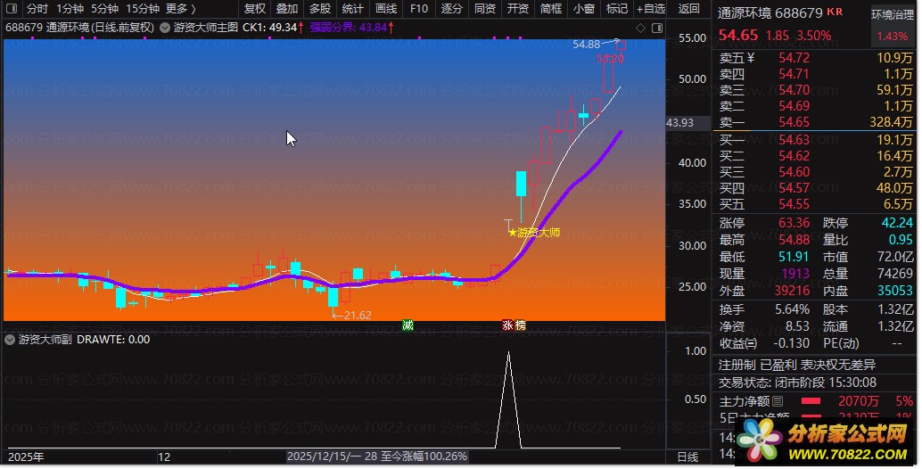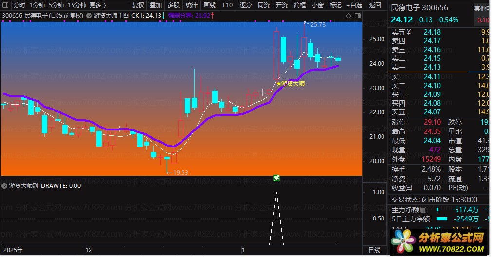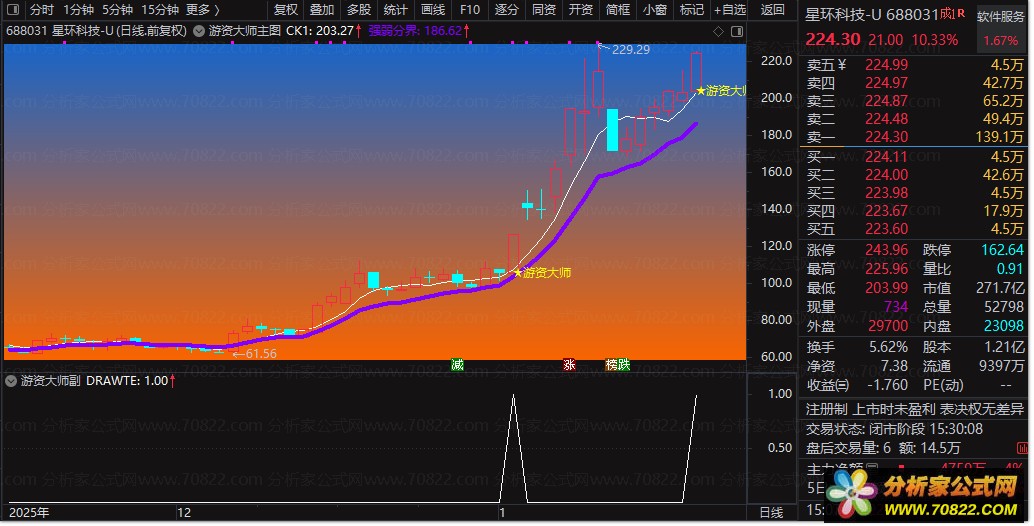 - 游资信号标识:当价格放量突破、短期均线多头排列且满足多重强度条件时,在K线下方标注“★游资大师”提示;