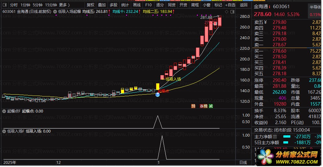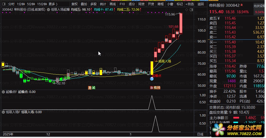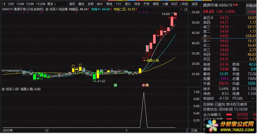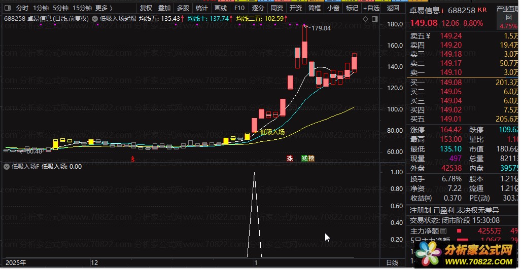 〖低吸入场起爆点〗捕捉主力低吸起爆点,趋势盛宴下的精准乃天下无敌 本套公式由“低吸入场起爆点主图”与两个配套选股公式(“低吸入场选股”“起爆点选股”)组成,专为短线强势股捕捉设计。主图通过5/10/25日均线叠加价格区域着色(蓝→绿→灰→黄→红),直观反映股价所处的强弱区间;当出现“←低吸入场”或“起爆点”信号时,往往预示主力资金开始介入。