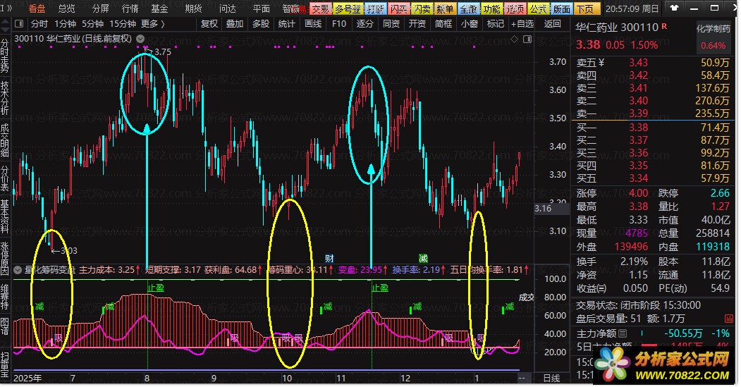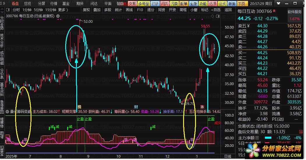 - 辅助参考:25线为筹码强弱分界,上方红柱表示筹码集中利于上涨;操盘线(红线)上穿价格为多头信号,跌破停损线需警惕风险。