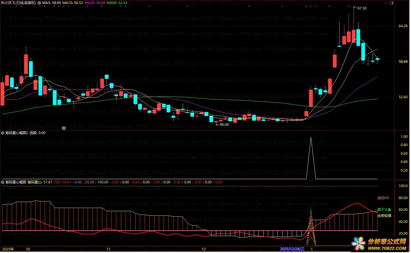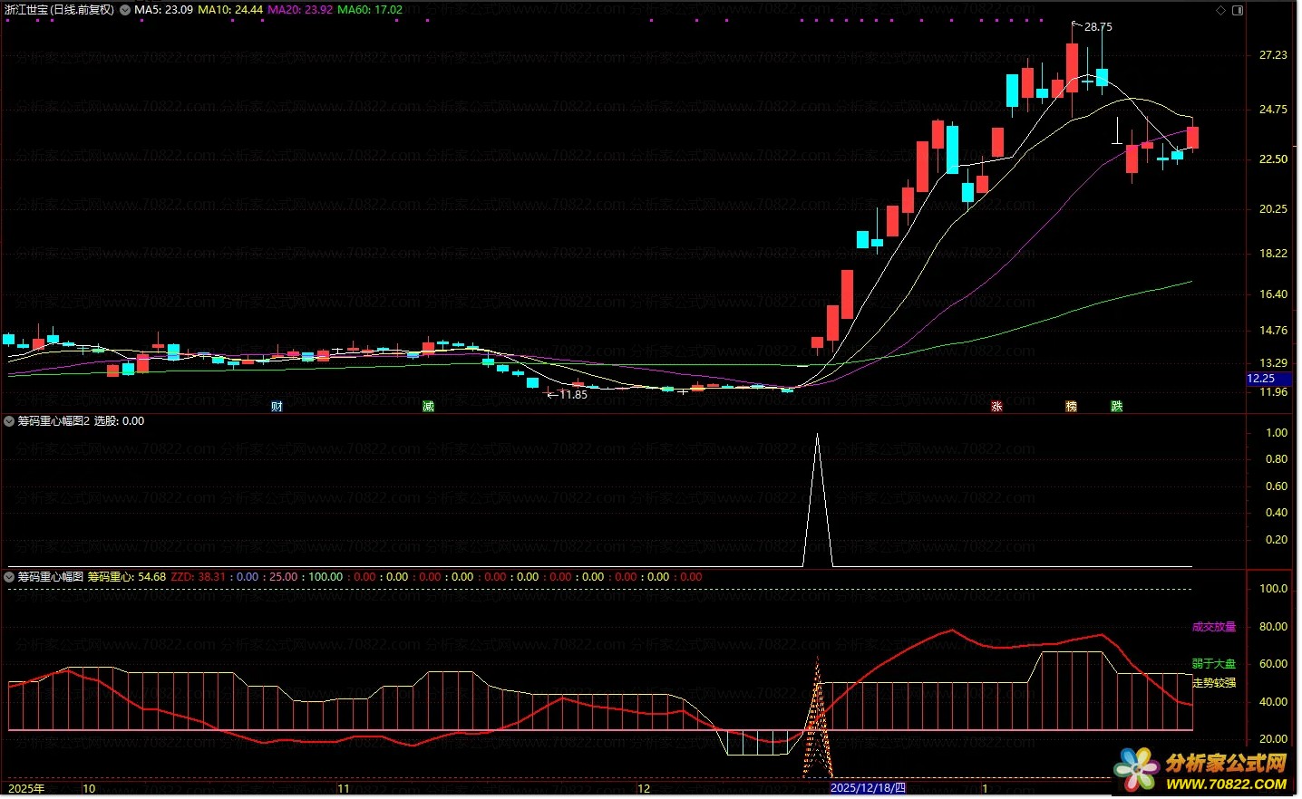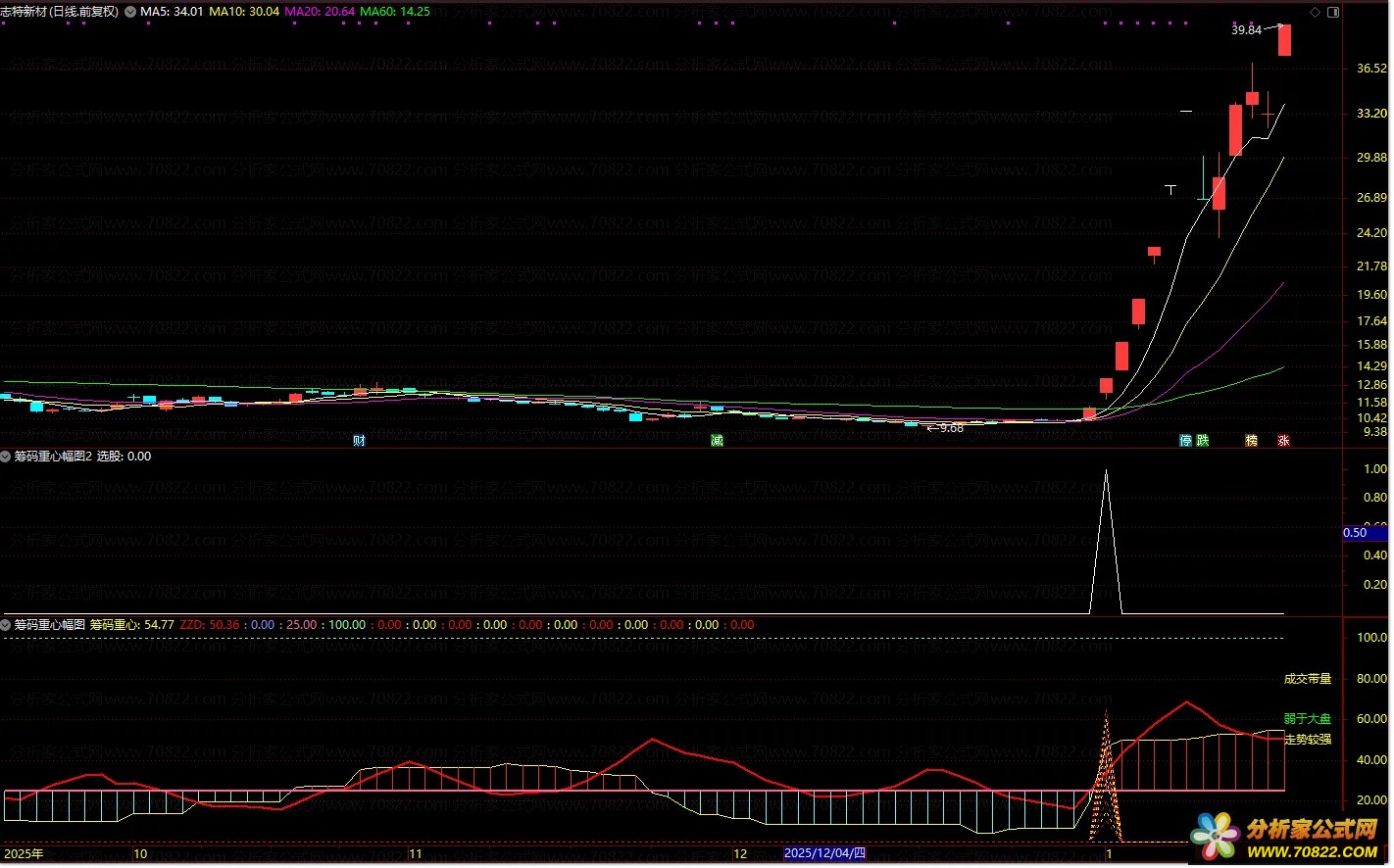 筹码重心副图选股指标是一款多维度的个股综合研判工具,专为日线级别趋势分析设计。该指标深度融合筹码分布、动向指标、量能分级以及个股与大盘相对强弱四大核心维度,不仅实时呈现个股的量能特征与筹码位置,更通过“筹码加动向”双突破机制,精准识别关键趋势启动信号。当筹码重心与多空分歧度同步向上突破时,往往预示着强势上涨行情的开启。