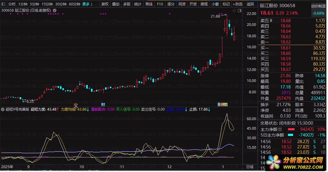 买入信号:CROSS(超短力度,力度均线) AND 超短力度>0 AND 量能配合;