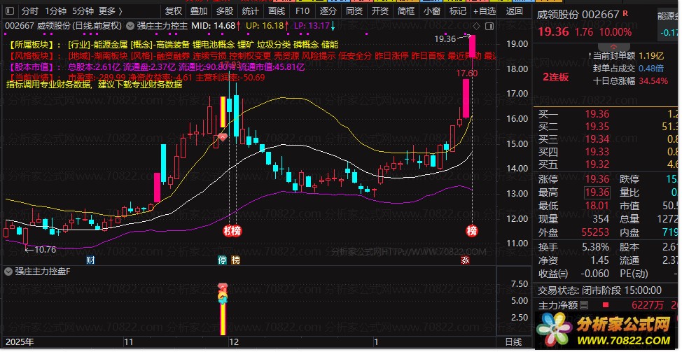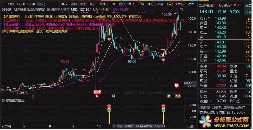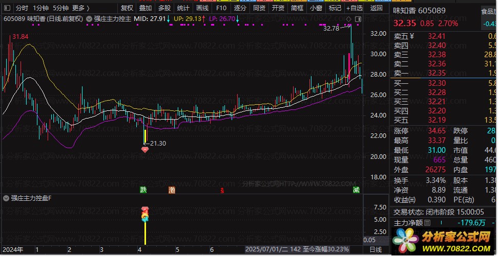〖强庄主力控盘〗指标套装,主图叠加多维度量化分析系统 本指标为一套功能全面的通达信主图叠加指标。它集成基本面信息显示、主力资金监控、K线形态识别与涨停捕捉功能,并结合趋势与抄底信号,形成多维度矩阵模型策略。