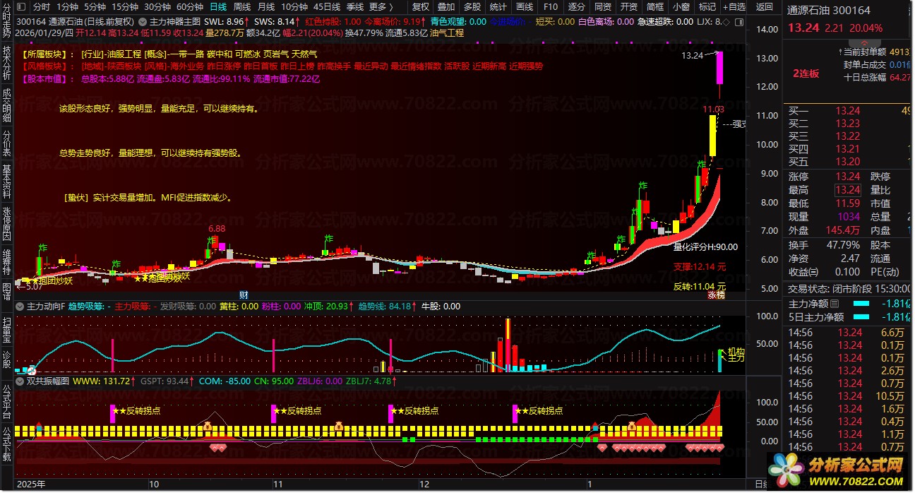 2. 副图公式观察“控盘启动”突破100及“极致反转”紫色柱,配合黄色能量柱放大确认;