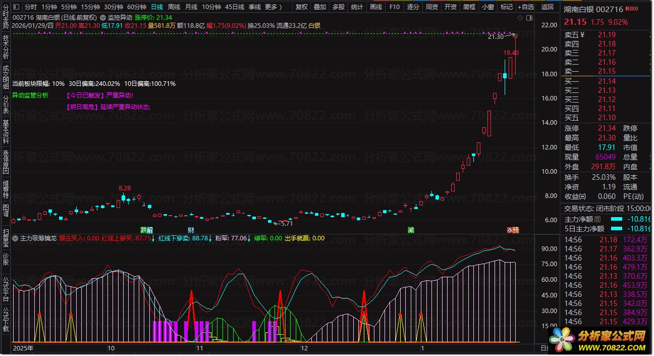 很实用〖监控异动和模拟涨停K线〗主图+选股指标,也算是小“避雷”功能 本指标很实用的功能是: