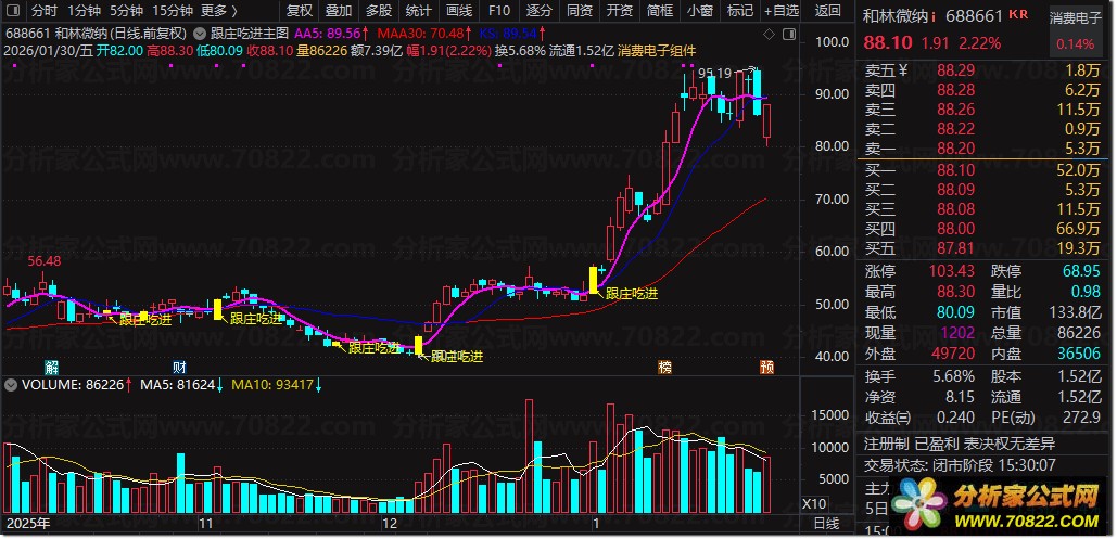 1. 主图公式用于观察个股是否出现“跟庄吃进”文字及黄色K线;