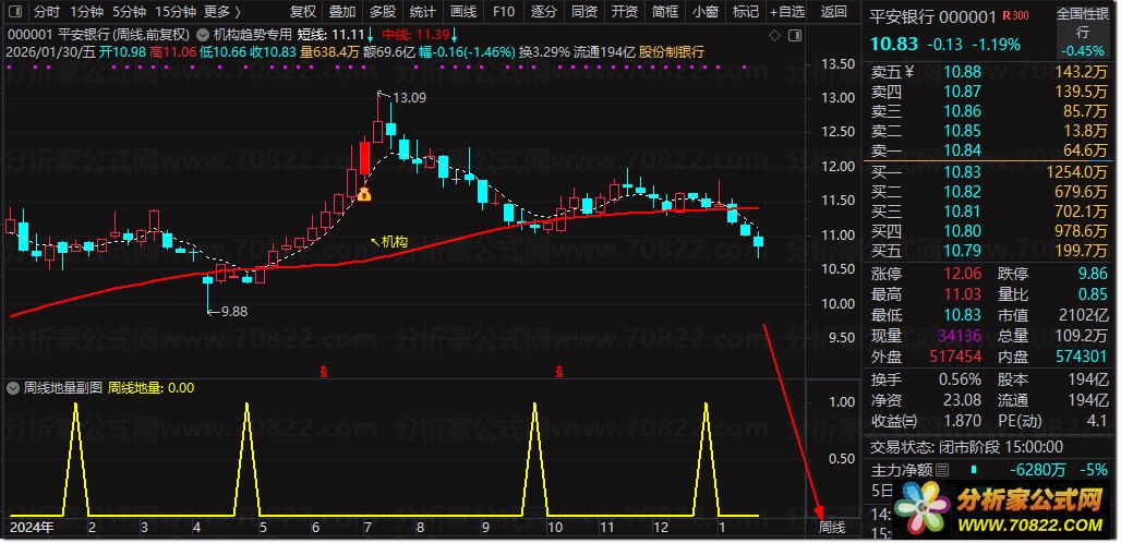 2. 该指标将均线调整至周线级别进行考量,在整个周线周期完成后,相应的信号才会稳定下来不再变动。