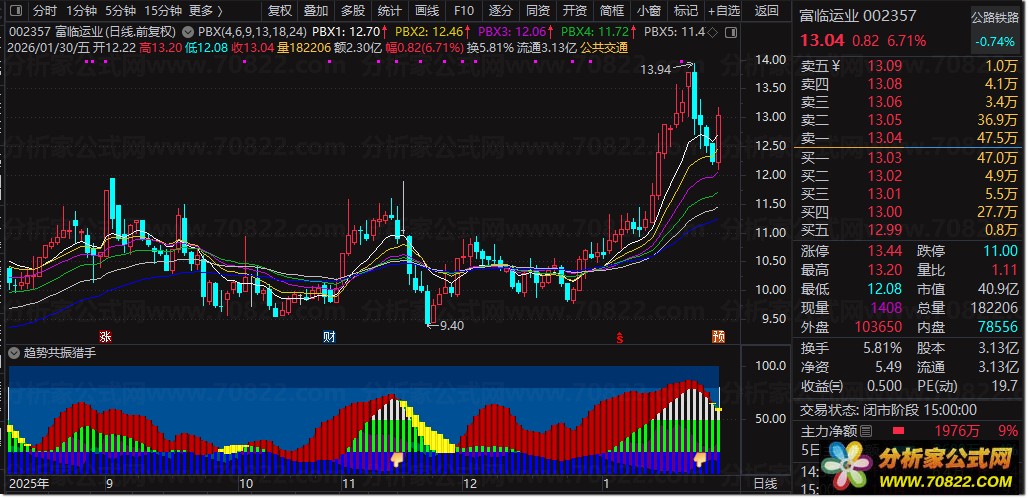 「趋势共振猎手」是一款专为中高级交易者打造的复合型趋势动能分析工具。它巧妙融合了ADX趋势强度、KD随机指标与RSI动量信号,构建出“市场状态识别—动能共振确认—背离风险预警”三位一体的决策体系。不同于传统单一买卖点指标,本公式通过彩色带状图与动态柱状结构,直观呈现趋势强弱、多空动能对比及超买超卖区域,帮助用户在强势趋势中顺势而为,在动能衰竭时及时规避风险。