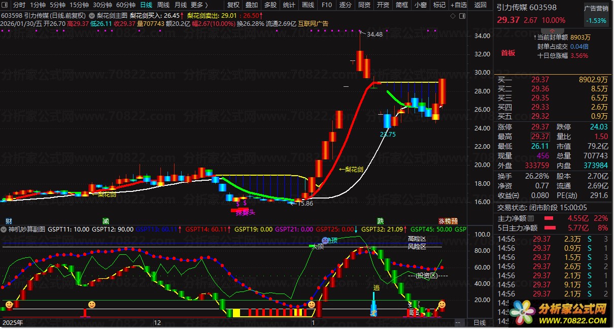 “梨花剑主图” 专业级股票技术分析工具 极致可视化经典战术公式 本指标是一套集成多种经典战术形态的复合型股票交易系统。它将趋势跟踪、K线组合、突破信号与动量反转等多种股票技术指标公式,通过顶尖的可视化技术融合于一张主图之中,旨在为交易者打造一个高信息密度的股票分析工具与决策面板。