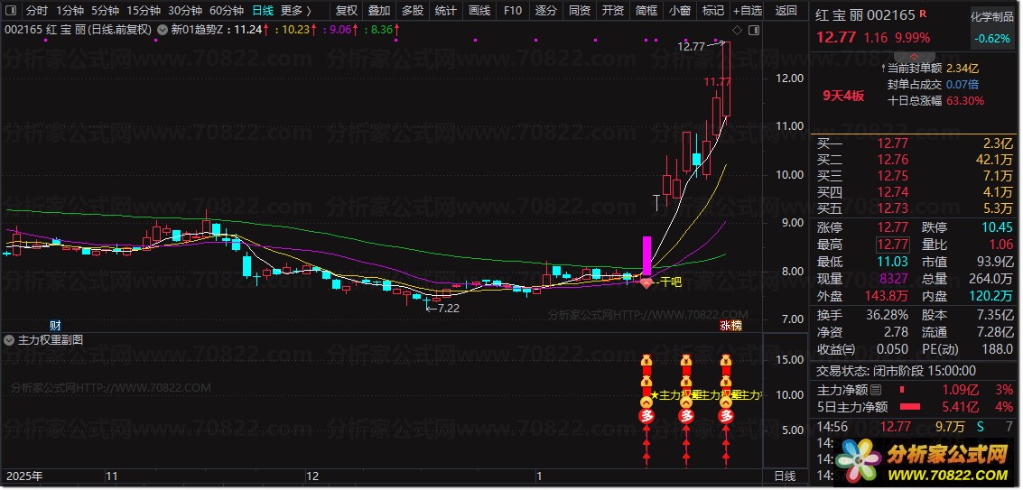 1. 副图公式:加载至个股K线图下方,出现粉红+蓝色柱状及多重图标提示时,即为主力启动信号;