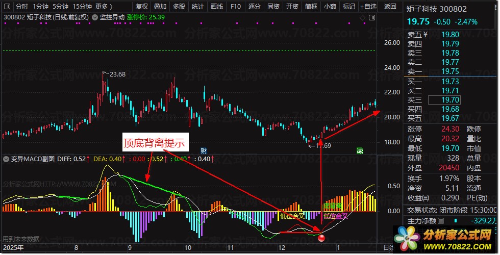2. 变异MACD具备多种智能提示功能,包括低位金叉提示、低位二次金叉提示、顶背离提示以及底背离提示等。这些信号的使用逻辑与传统MACD一致,但优势在于:一旦信号触发,系统会直接给出明确的操作建议,省去了投资者反复研判的步骤,提升决策效率。