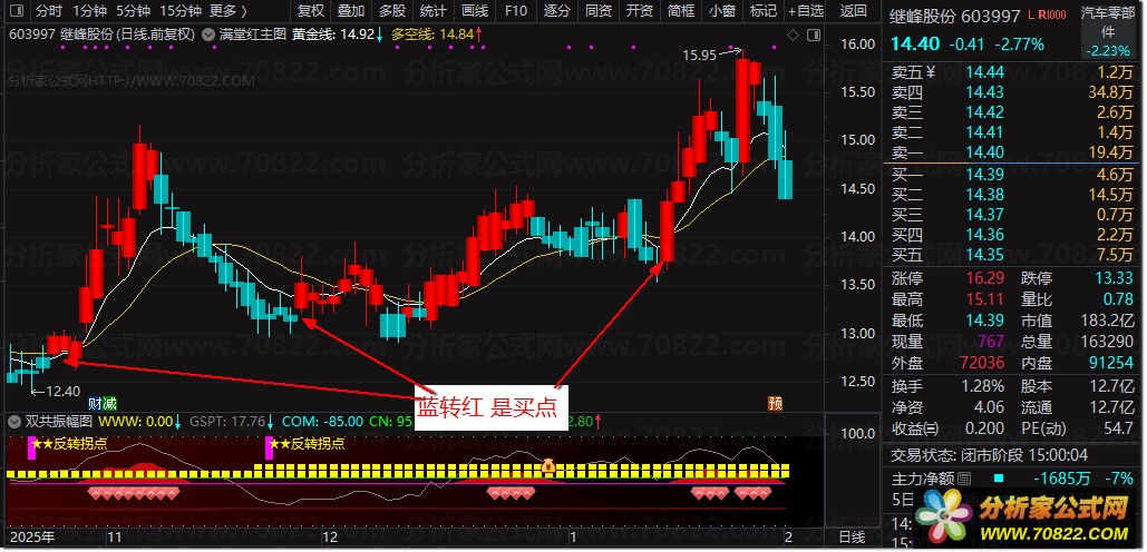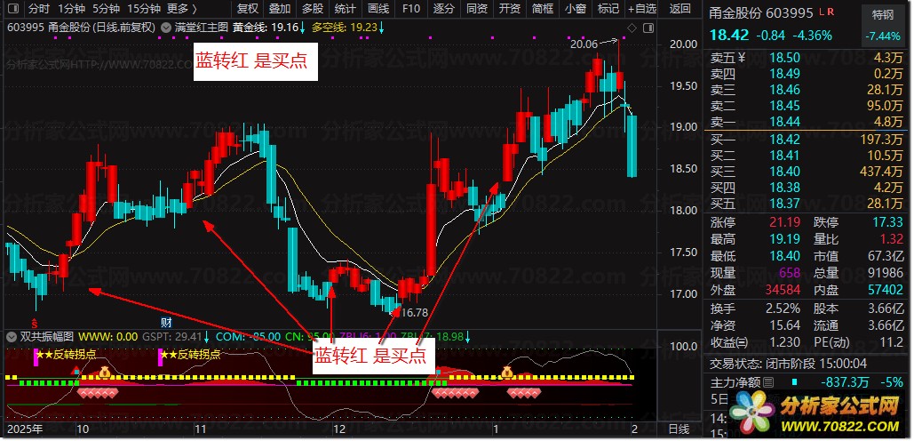 3、买卖点提示:蓝色转红色时,为买点信号;红色转蓝色时,为卖点信号。
