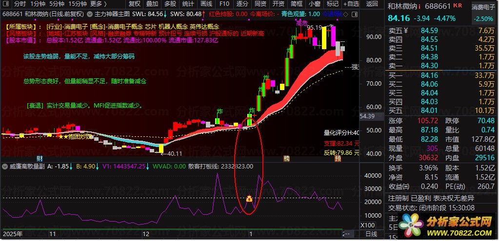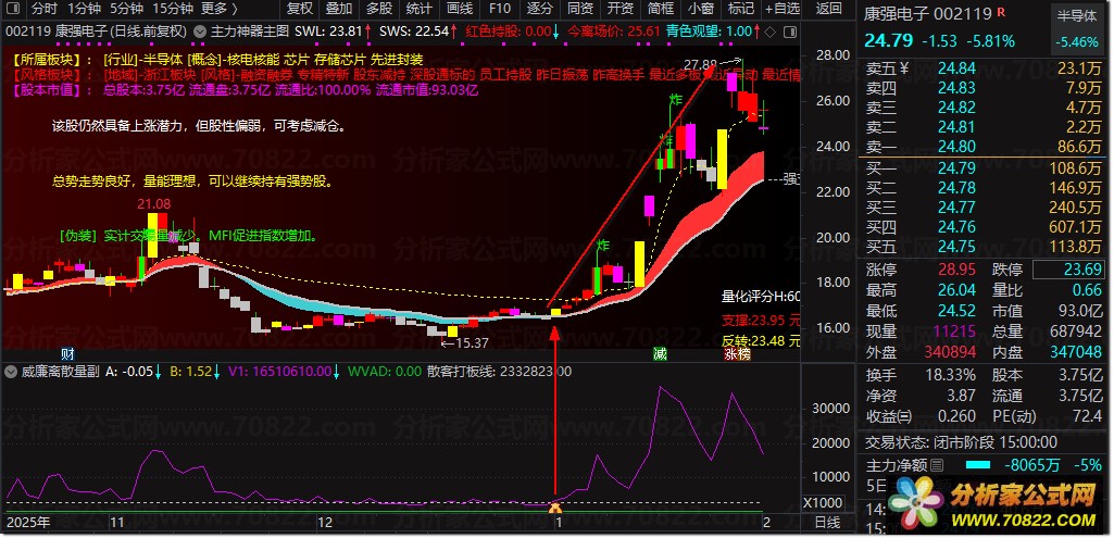 不同于常规软件中常见的双线型副图指标,本版“威廉离散量”特别强调“箱体形态”的识别价值。当股价有效突破前期高点且伴随指标同步走强时,通常构成可靠的买入信号,此时可考虑小仓位试仓。尤其在全面注册制实施后,个股易受“±8%磁力效应”影响,价格容易向涨停或跌停方向加速运行,因此建议投资者采取分散持仓策略,以有效控制风险。