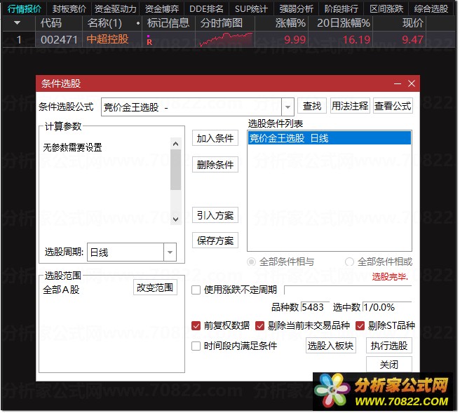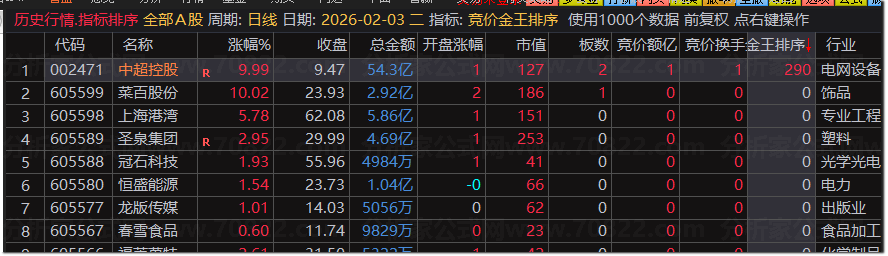 开盘前补好日线数据,于集合竞价阶段(9:15–9:25)快速排序全市场股票,优先关注排序靠前、且满足基本面逻辑的个股,可作为短线打板或强势首板策略的重要辅助工具。