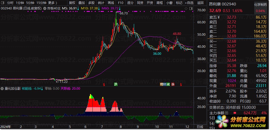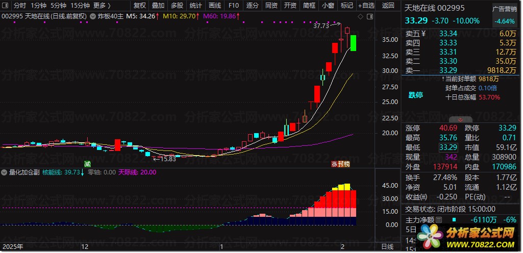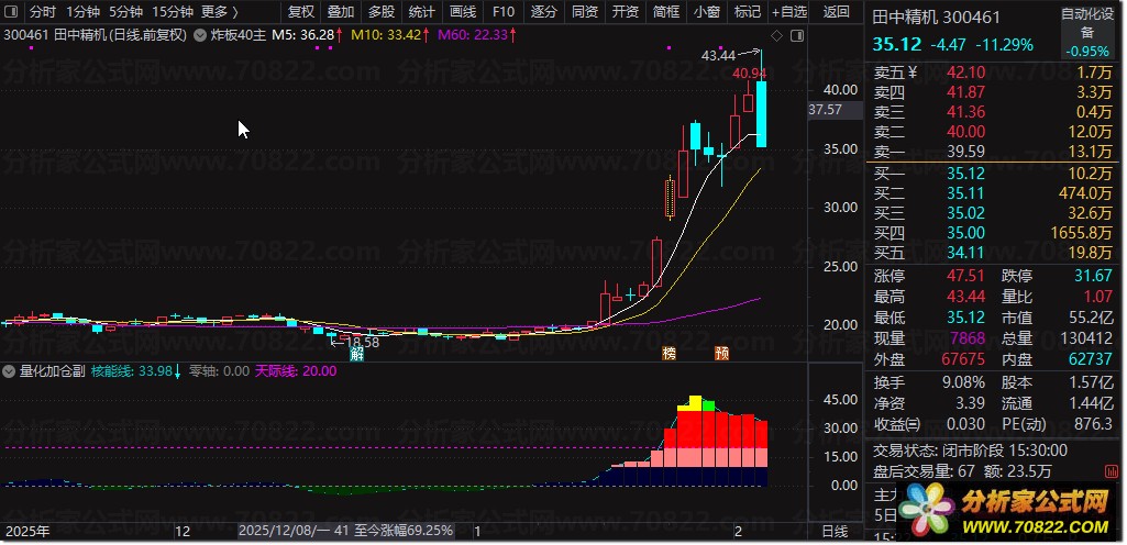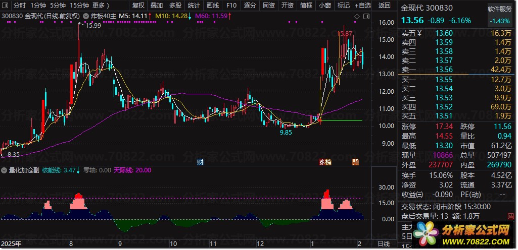 该股票公式指标结合价格偏离均线的程度与随机指标KDJ的平滑值,构建出“核能线”和“量化资金”两条核心曲线,用于判断市场趋势强弱与主力资金动向。当趋势向上、量化资金线上穿核能线且成交量明显放大时,触发“暴力加仓”信号,提示强势介入机会;当核能线从低位上穿负15时,提示“潜伏”布局时机;若核能线在高位下穿量化资金线,则发出“减磅”警戒信号。整体策略注重趋势确认、量能配合以及高低位反转信号的综合判断。