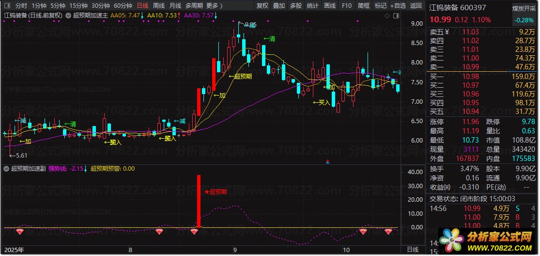 主图公式融合5日/10日/30日均线、乖离率、角度趋势与加速度模型,动态标注“买入”“加仓”“减仓”“清仓”及“超预期”五大关键信号,并结合量能、大盘相对强度(YA_)给出多达25种操作建议,适合中短线投资者实时决策。