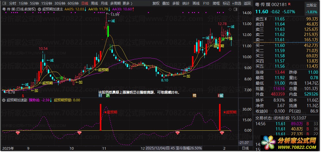 副图公式通过多周期动量与波动率构建“强势线”,当个股涨停(含ST股)且放量突破近期高点时,触发“超预期预警”,并以红色柱状与图标醒目提示,辅助判断强势延续性。