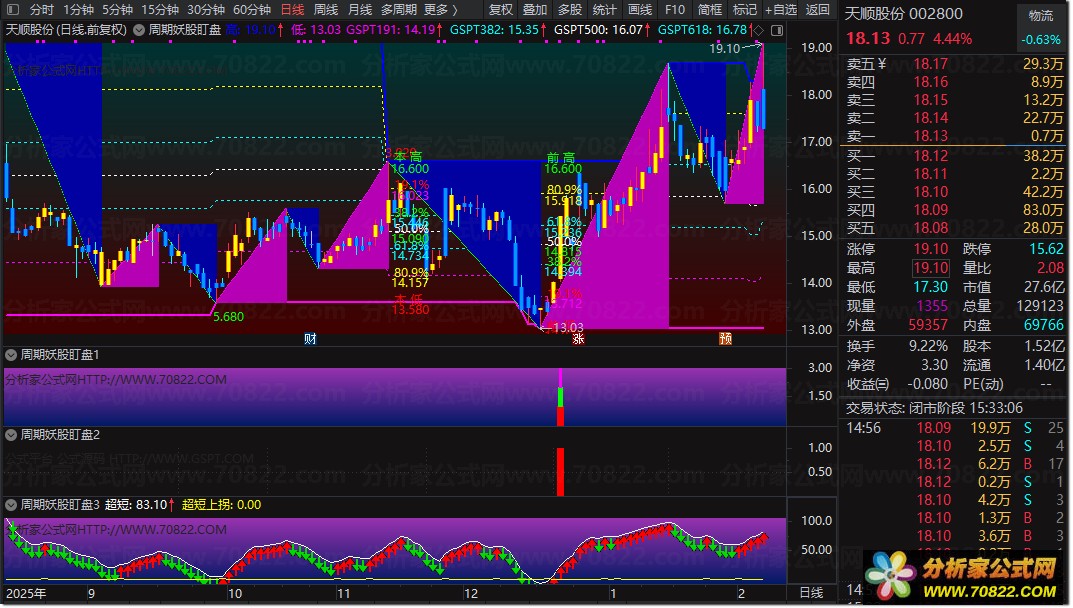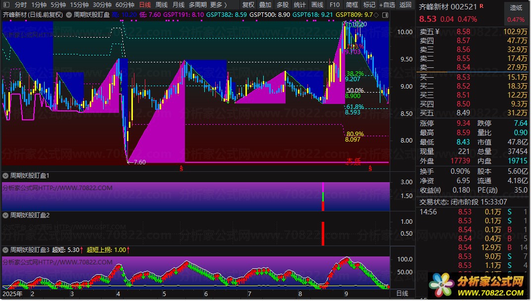 在我们的周期妖股盯盘系统中,主图上显示的紫色三角区域标示了强势区也即操作区,这里往往是超短线牛股出现笑脸标记的地方,意味着更高的胜率。