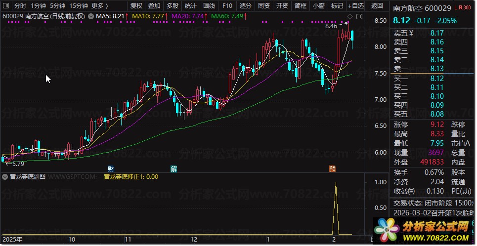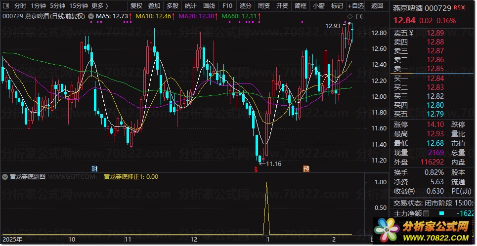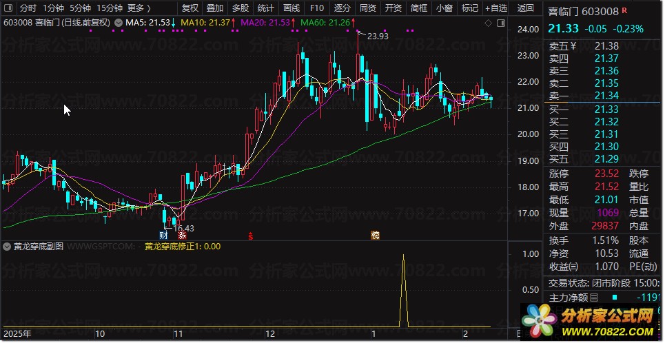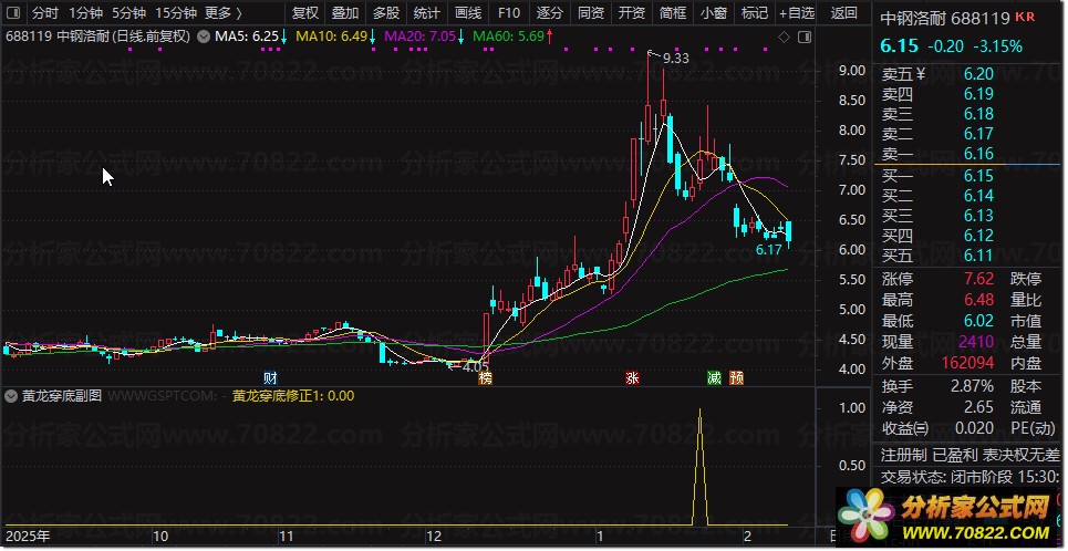 该股票技术指标仅提供一种信号提示——当“尖刀信号”出现时,往往意味着捕捉龙头股的高胜率时机已经到来。为便于实战应用,我们同步开发了配套的黄龙穿底选股公式,可直接用于通达信、同花顺等主流股票软件中筛选潜力个股。