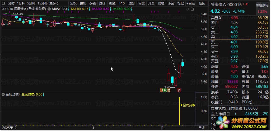 金底封喉指标包含副图指标与选股公式两部分。副图可直观展示个股资金动向与信号强度,选股公式则支持一键筛选出符合底部资金异动条件的潜力股,双重机制提升投资决策的准确性。此外,该股票公式指标完全兼容通达信电脑端与手机端,无论何时何地,都能便捷查看信号、快速筛选目标个股,满足不同交易场景的实际需求。
