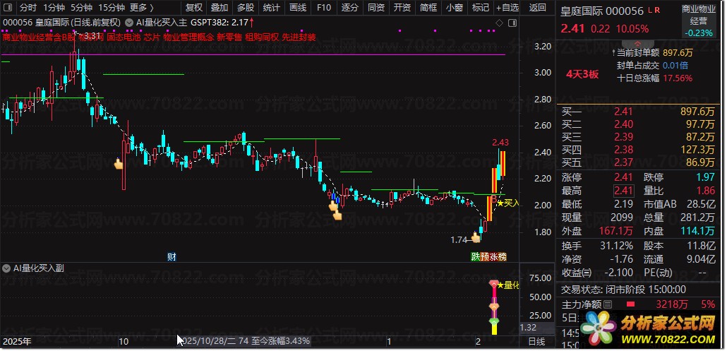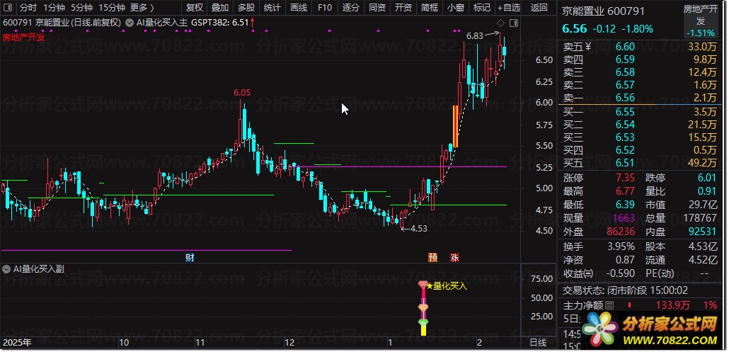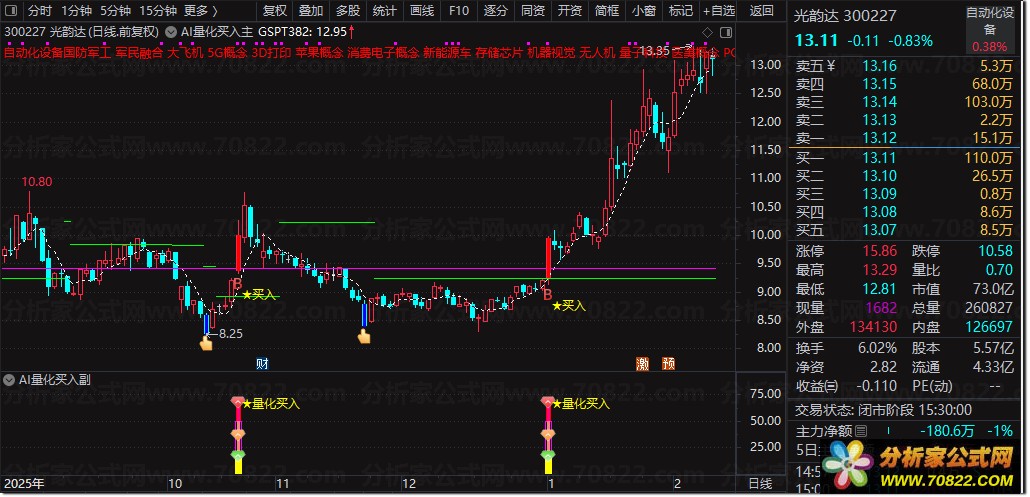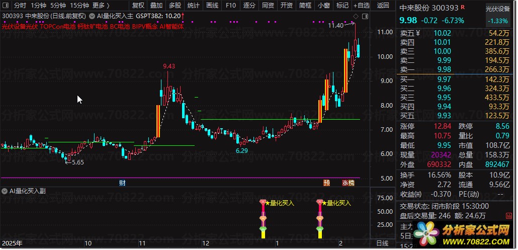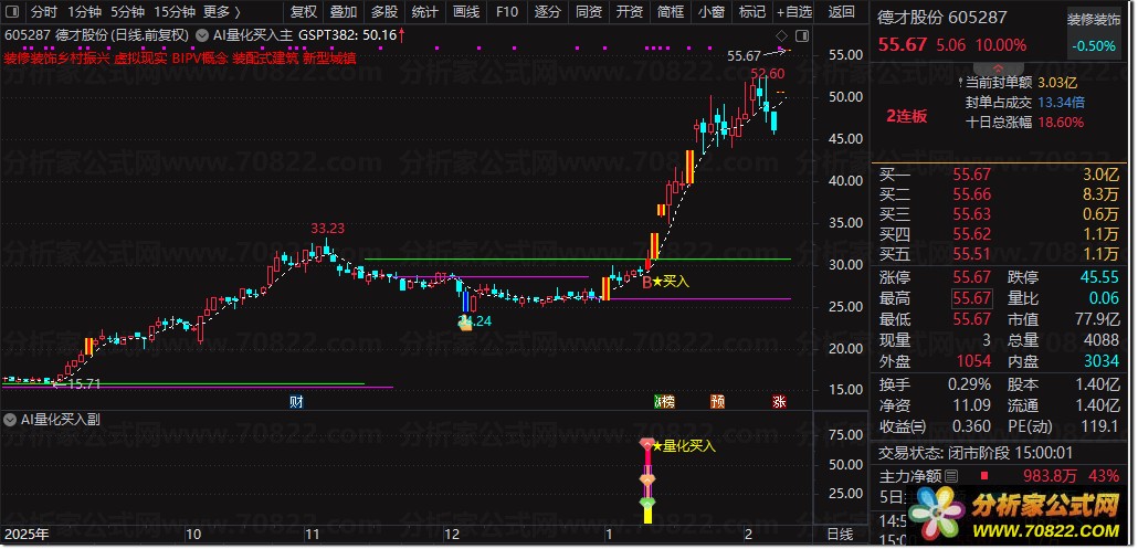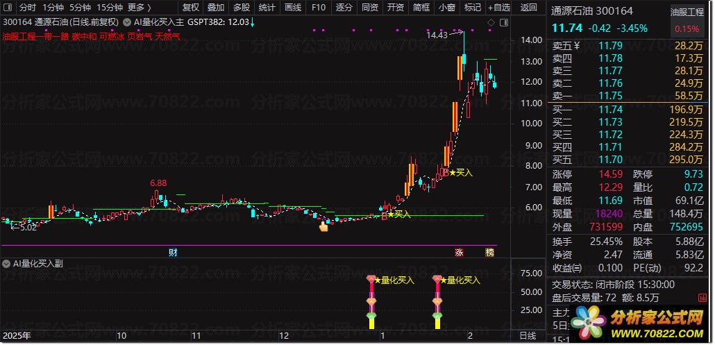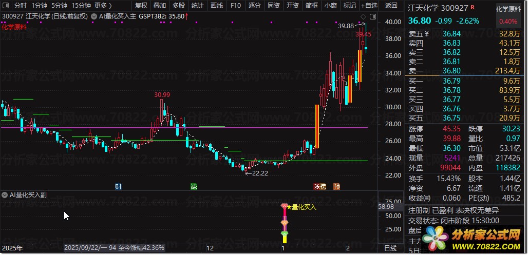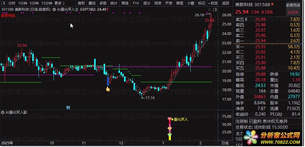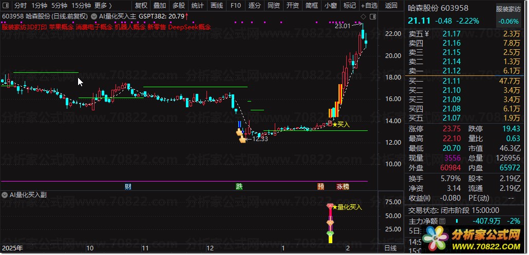 〖AI量化买入〗主图+副图+选股指标,精准捕捉强势启动点! “AI量化买入”是一套三位一体的智能交易系统,由主图、副图与选股公式协同构成。