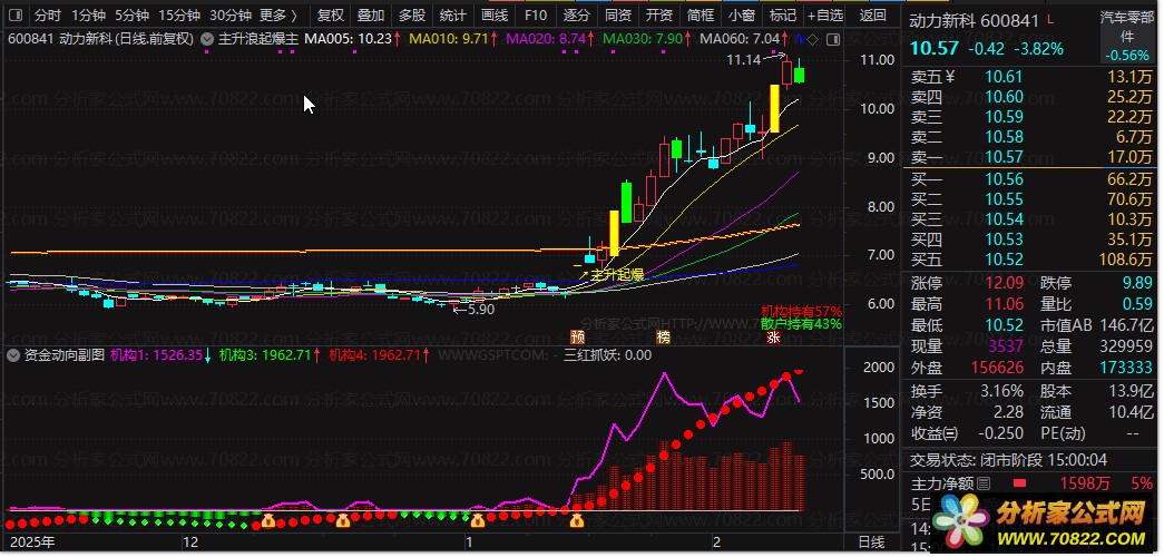 副图“资金动向”则从机构资金流、筹码分布及市场情绪多维验证,配合“机构买”“上升通道”等提示强化信号可靠性;
