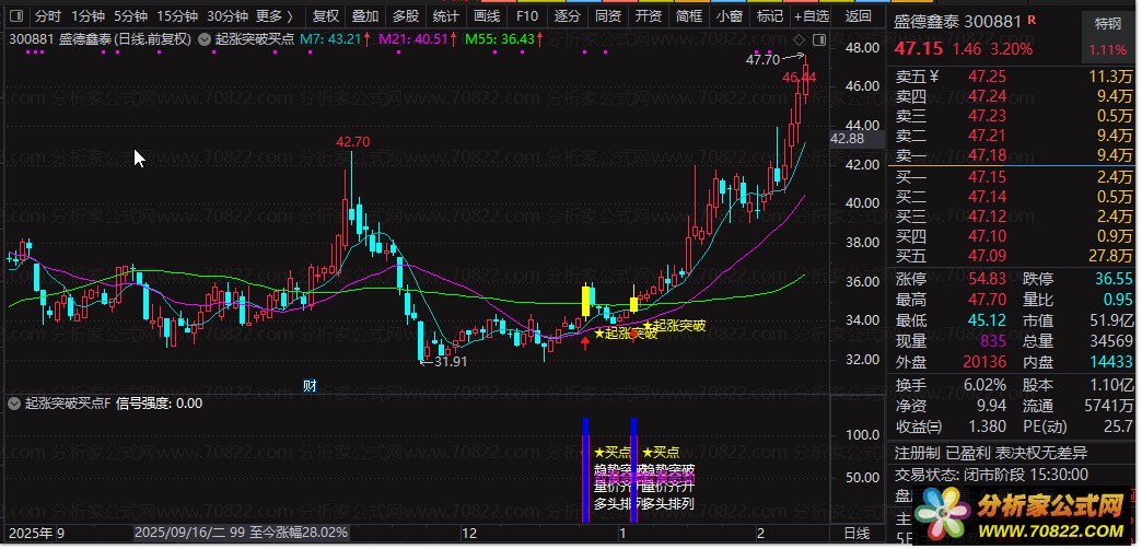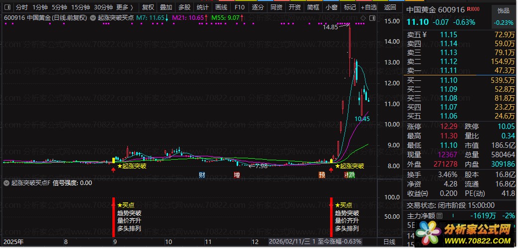 副图辅助确认信号强度,红色柱体代表买点,蓝色柱体提示放量;