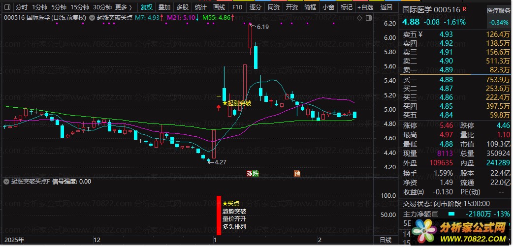 主图用于盘中观察个股是否出现黄色K线及“★起涨突破”标识;