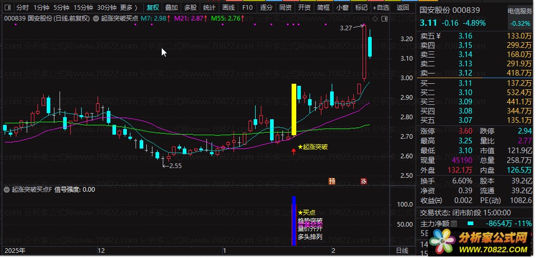 〖起涨突破买点〗捕捉主升浪启动信号! “起涨突破买点”是一套融合趋势、量能、价格与基本面筛选的多维智能交易系统,包含主图、副图与选股公式三件套。主图通过黄色K线高亮标注强势突破信号,并叠加多周期均线(7日、21日、55日、144日、233日)判断多头排列;副图以彩色柱状图和文字提示,直观展示“趋势突破+量价齐升+放量启动”四大关键要素;选股公式则严格过滤科创板(688开头)、ST股,并限定股价低于40元、流通市值20~500亿等条件,确保标的兼具成长性与流动性。