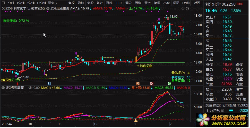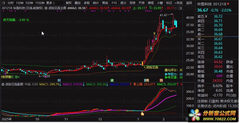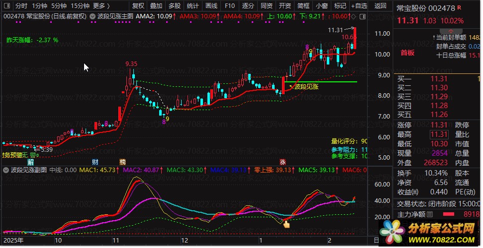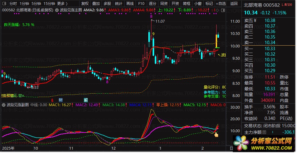 〖波段见涨〗MACD增强共振系统主副图指标公式 精准捕捉趋势转折点与买卖信号 无未来函数 使用方法说明 【波段见涨】指标融合价格强度、成交量分布与MACD动能,精准识别趋势共振点。当短期均线上穿支撑位、动能指标转强,且MACD快线上穿支撑点时,系统以红色粗线标识上升趋势,并呈现均线多头排列,同步发出买入信号。 信号出现后可择机低吸,建议结合主图中的上下轨通道、中间粗红趋势线、底部绿色横线及九转序列,同时参考副图MAC3与MAC4线的颜色变化进行持股决策,提升波段操作胜率。