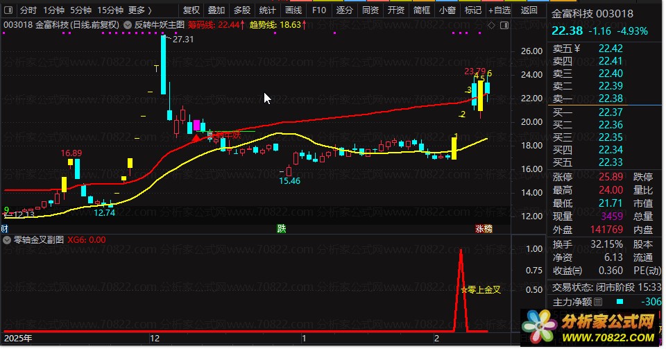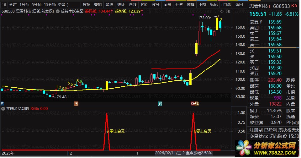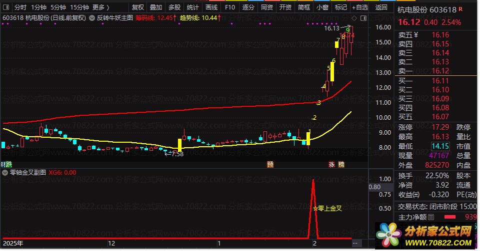 此公式还结合了价格突破多条均线、成交量放大、非ST类股票等多重条件,进一步筛选出具有强势上涨潜力的个股。在实际应用中,投资者需要观察副图指标,一旦发现有红色实心柱出现,并标记“☆零上金叉”的文字提示,这便是系统识别出的一个强烈的买入信号。