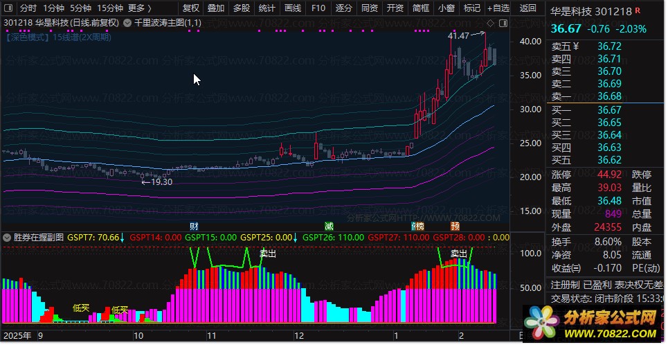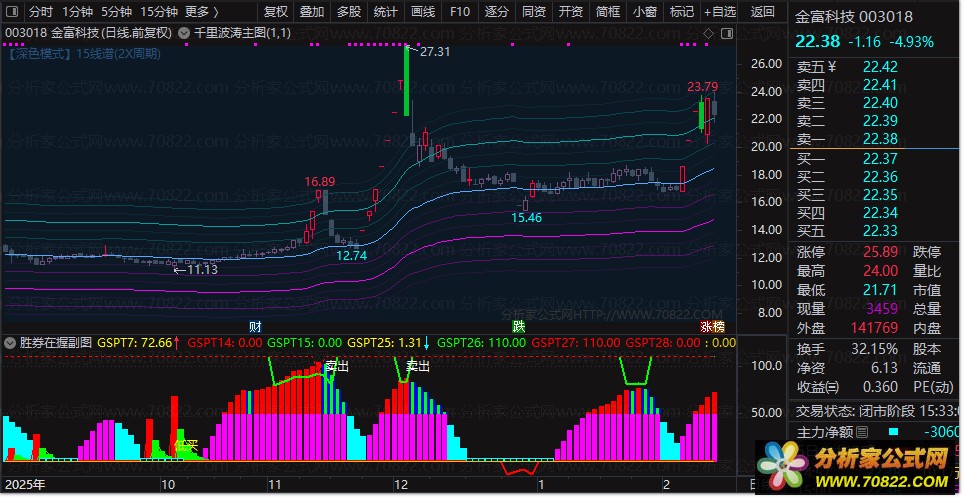 〖干里波涛主图〗判断市场活跃度 趋势强弱 主图通过15条动态均线构建价格通道,结合成交量与价格波动率判断市场活跃度,并以不同颜色K线突出强势/弱势信号;