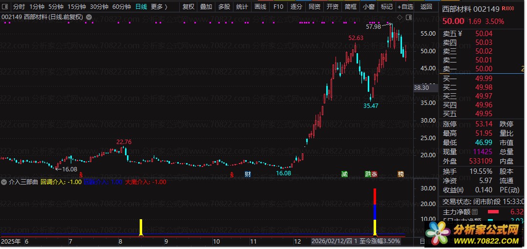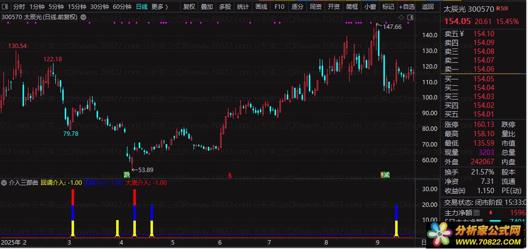 将副图公式加载至个股K线图下方,观察三色柱出现位置;