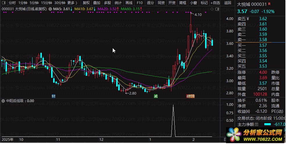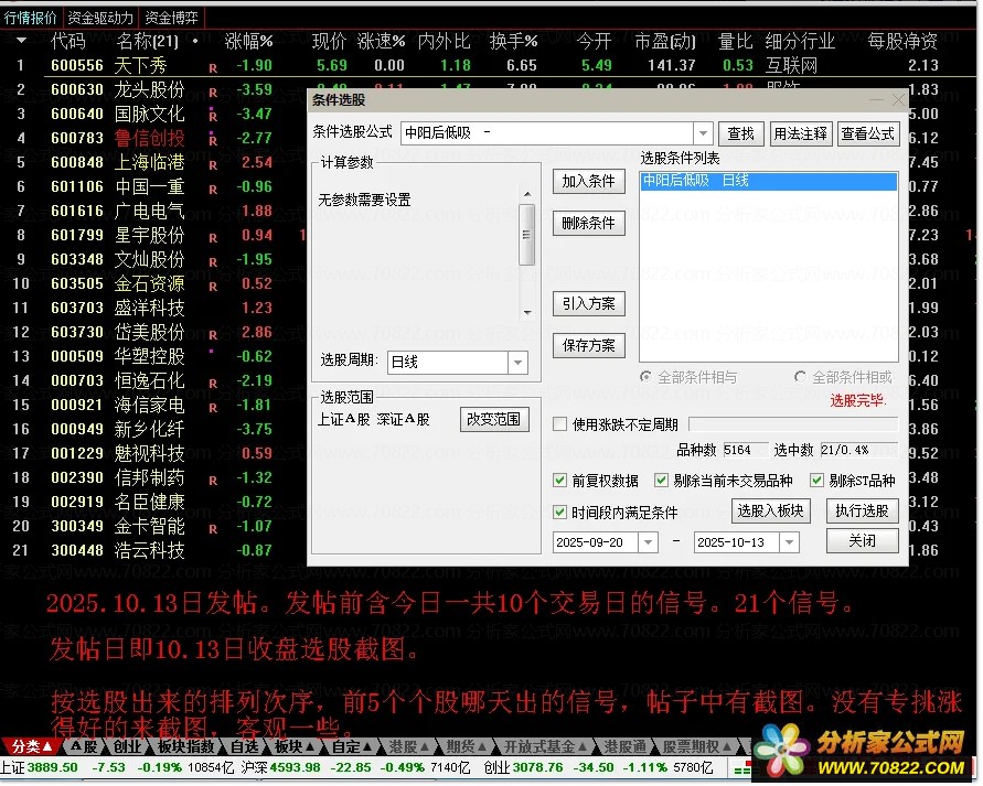 案例图例为2025年9月20~10月13日中阳后低吸选股结果,所展示的前5只个股K线图未经筛选,真实反映选股效果。该副图+选股指标发出的多数信号次日均有溢价表现,极个别信号虽次日小幅亏损,但通常能在随后几日内修复并转盈,整体胜率与稳定性表现优异。