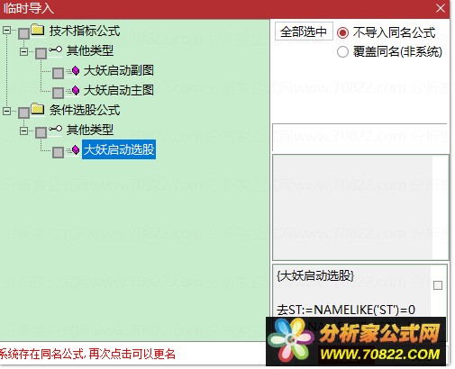* 关于股票公式时间限制,如果在引入大智慧公式,交易师公式或者飞狐公式的时候,发现公式名称栏是空白的,这时候调整电脑时间到1997年,又能出现公式名称,并且能正常显示,可能是公式使用期限已过。