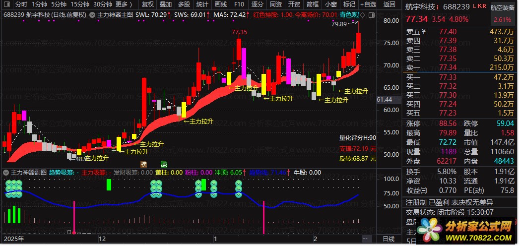 主图公式融合多周期均线、动态支撑阻力、超跌信号及量化评分,通过红/青色K线直观显示“持股”或“观望”状态,并标注关键进出价位;