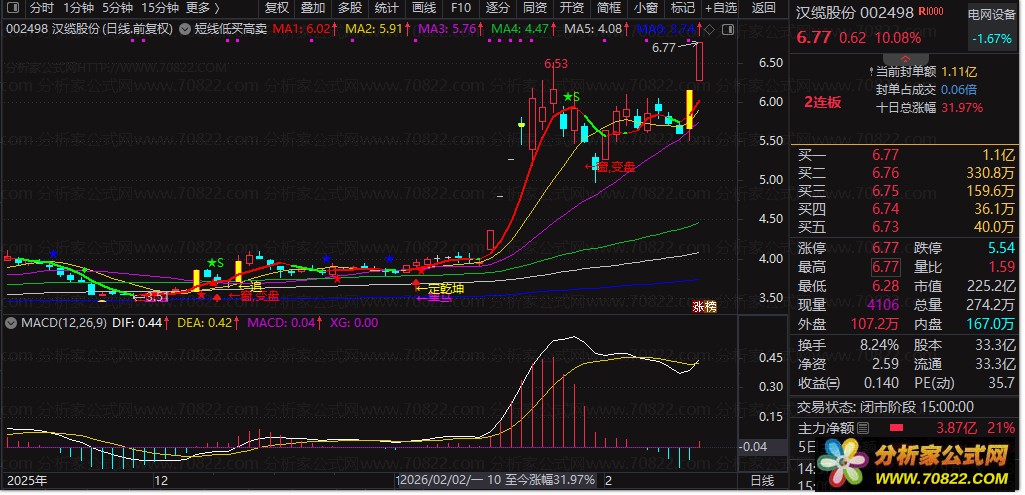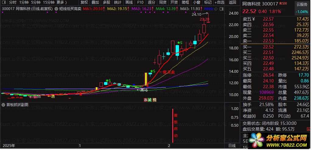 适用于日线级别短线操作。当出现红色“←底背离”“←吸”或“★”买入信号,且股价站上5日均线(红线)时,可考虑低吸;当出现绿色“★S”或“◆”卖出信号,或股价跌破5日均线(绿线)时,及时止盈离场。