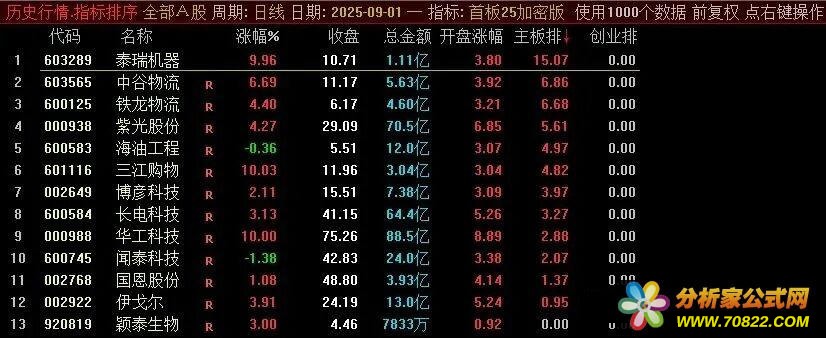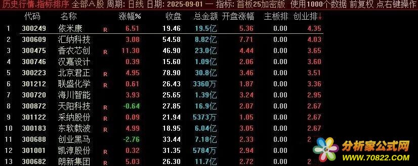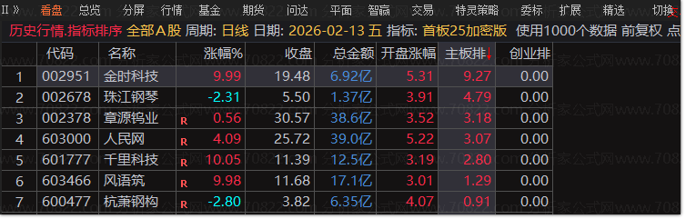 使用前请确保每日盘后下载通达信专业财务数据,以保障指标正常运行。排序界面会分别显示“主板排”和“创业排”两个数值,按从大到小排序后,只需关注各自板块中排名第一(数值最大)的个股即可。