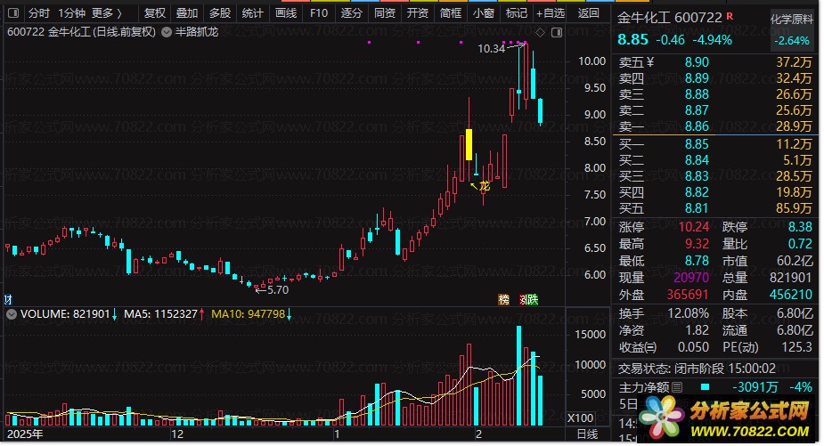 使用方法:将本公式作为副图加载至个股K线界面,当出现黄色“↖龙”文字及粗红柱信号时,即为潜在买点。适用于短线高手结合量能、板块热度进行二次确认,是通达信强势股选股公式、涨停回调战法指标中的实用工具。
