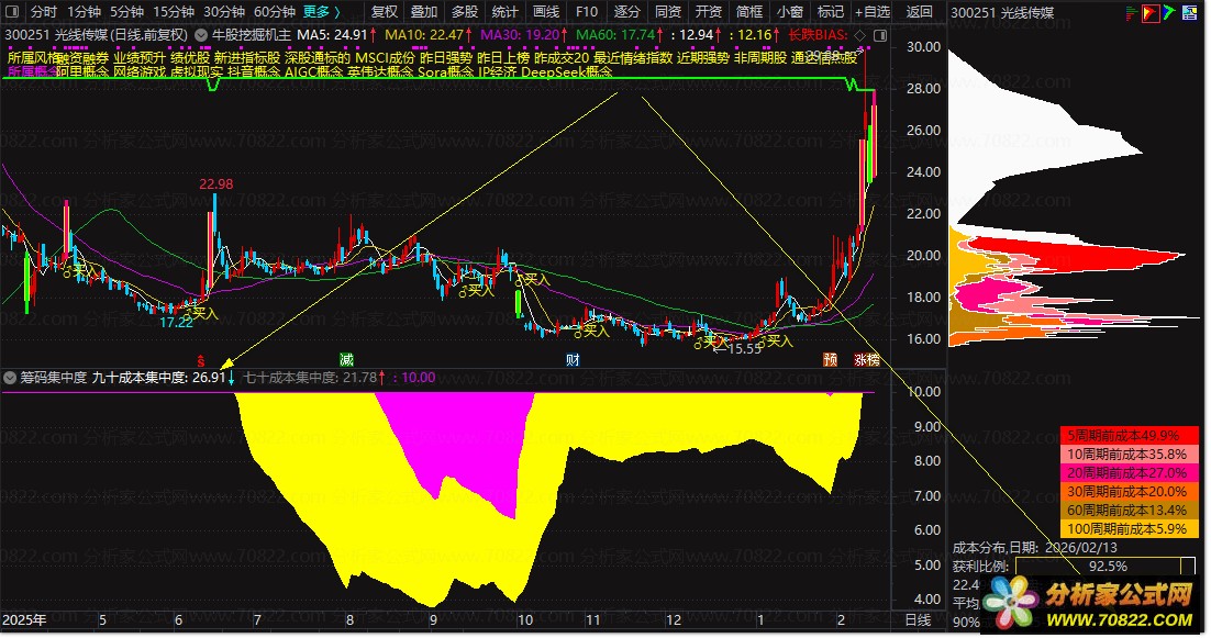 2、筹码超集中是判断主力是否已经吸足筹码的关键证据。它意味着大部分流通股都集中在了一个非常狭窄的价格区间内,市场抛压极小。
