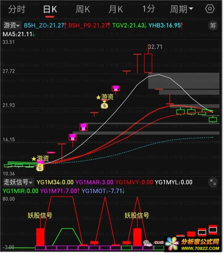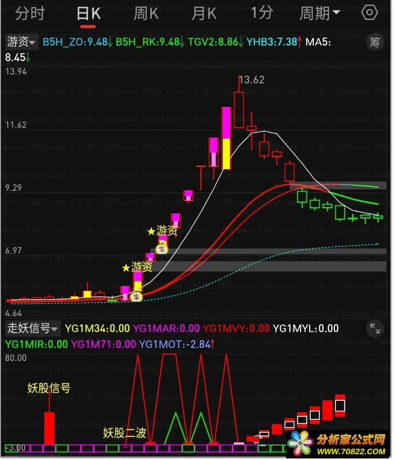 信号识别:红色柱状+ "妖股信号"文字=主力启动点,黄色"妖股二波"=二次拉升机会。