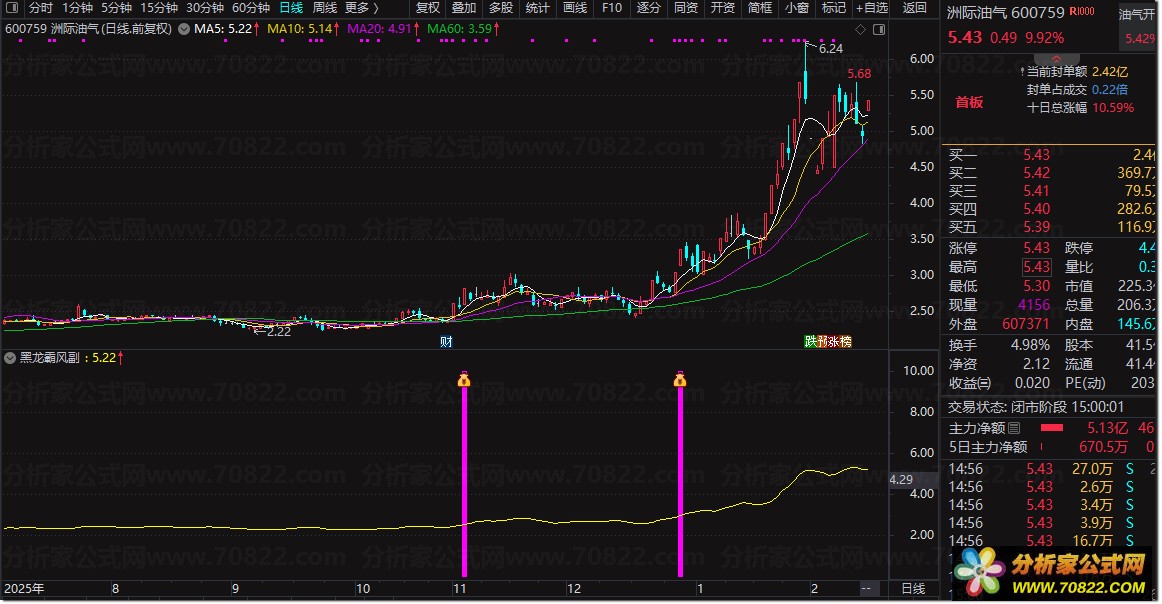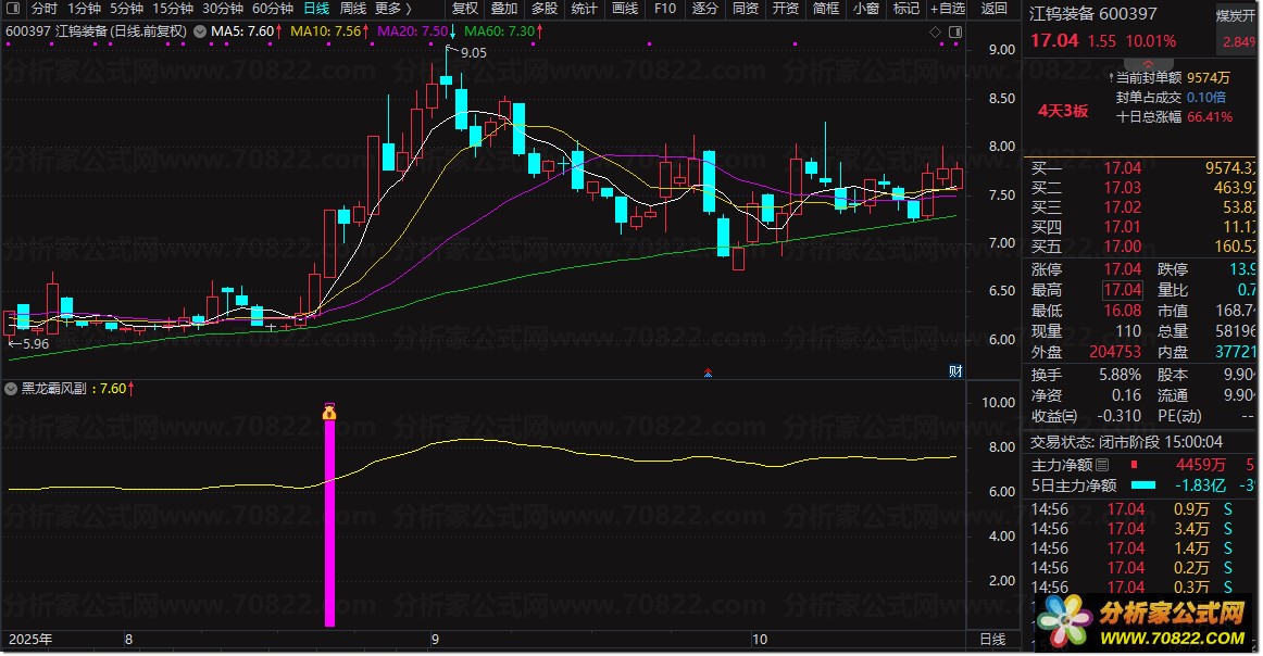 信号识别:当副图出现紫红色柱状体、顶部显示数字“9”图标及“★黑龙霸风”黄色文字时,即为买入信号。