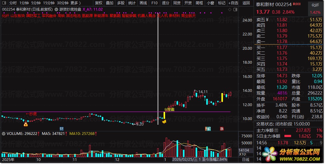 “游资抄底控盘”是一套专为捕捉强势股回调后二次启动而设计的实战系统。主图通过智能算法识别60日内的最低点,结合大阳线确认底部结构,自动标记“←抄底”信号;同时动态计算主力控盘成本线,当股价放量突破关键压力位时,显示“☆控盘”提示,直观展示游资介入痕迹。副图与选股公式联动,将复杂的量价关系转化为明确的买卖指令。