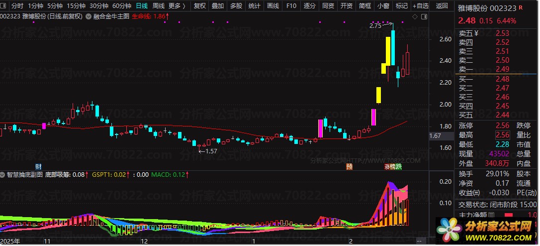副图确认:配合副图红色色带放大及MACD金叉,确认资金进场。