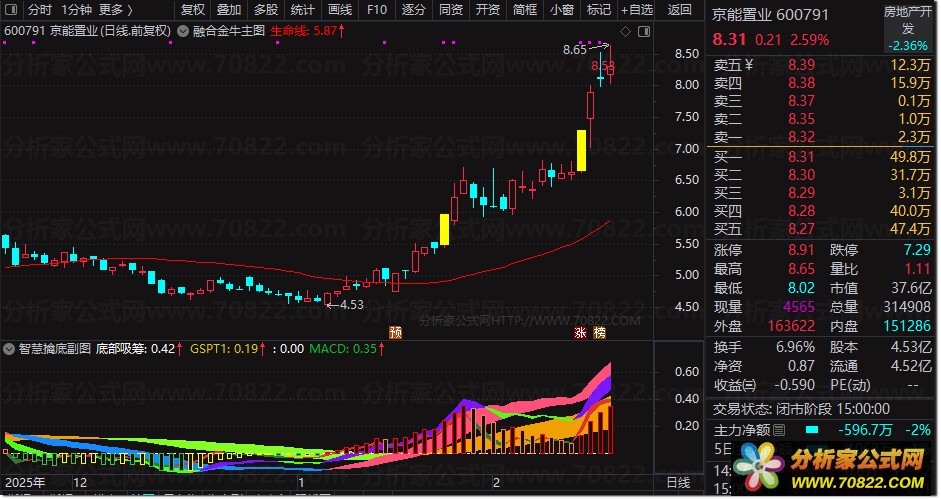 “智尊擒底”是一套专为捕捉超跌反弹与主力启动点设计的通达信实战系统。主图融合六条均线、动态支撑压力及筹码分布,独创“智尊擒底”黄色文字与红图标信号,精准提示波段底部;同时标注“见顶”、“危险”预警,辅助逃顶。副图通过多层MACD变异指标与色彩带,直观展示多空动能转换,红色区域即为主力吸筹区。选股公式基于DMI趋势强度,专门筛选ADX金叉ADXR的强势反转个股。