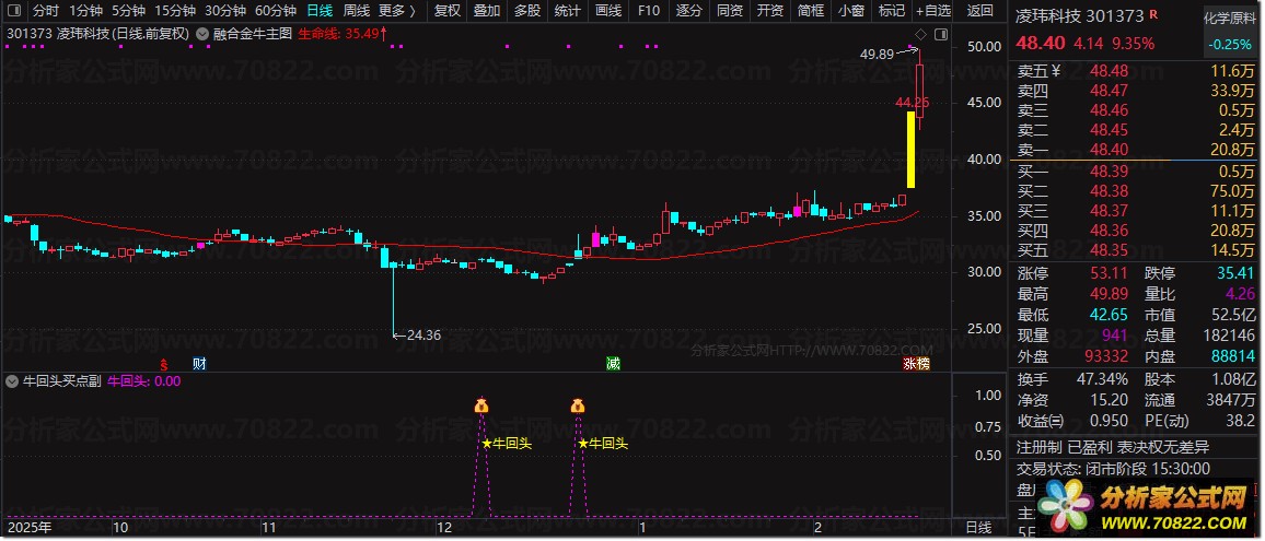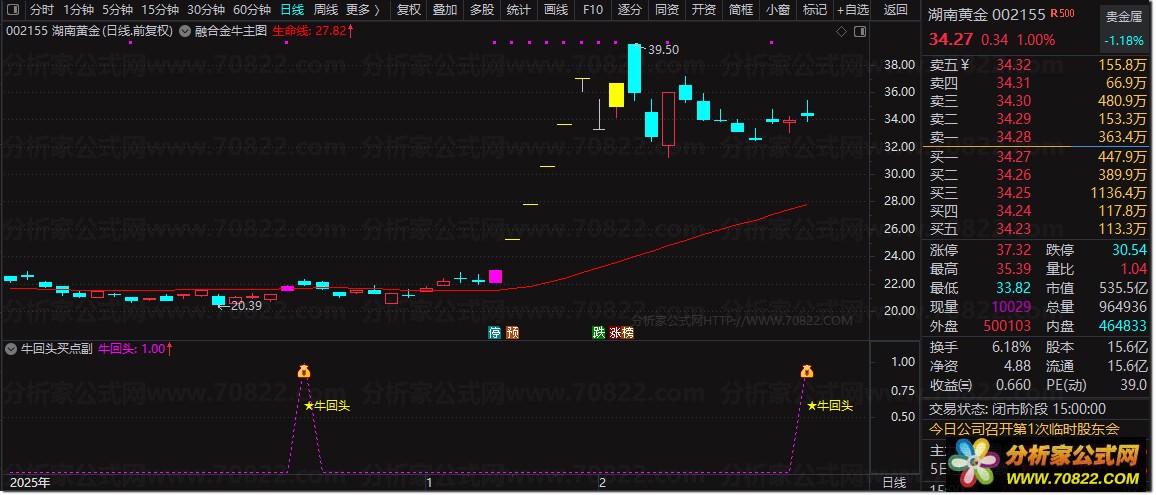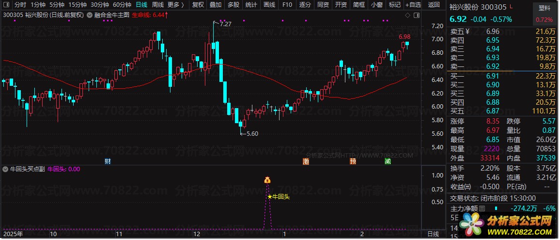 看盘: 主图出现黄色“★牛回头”图标,且副图对应位置亮起紫红色信号点,即为最佳观察区。