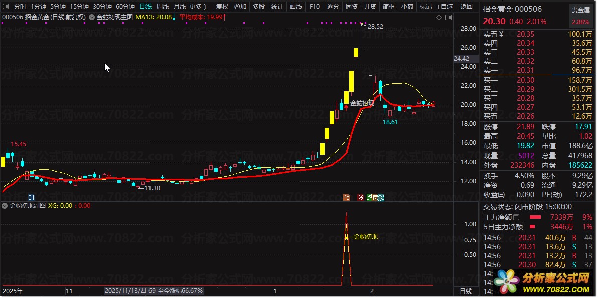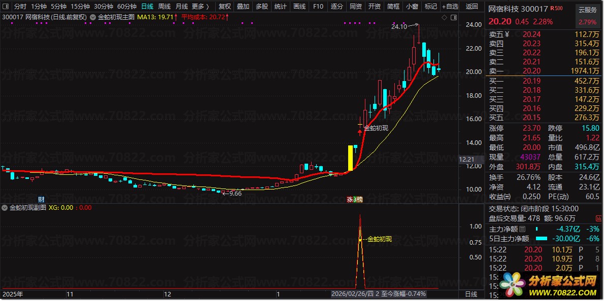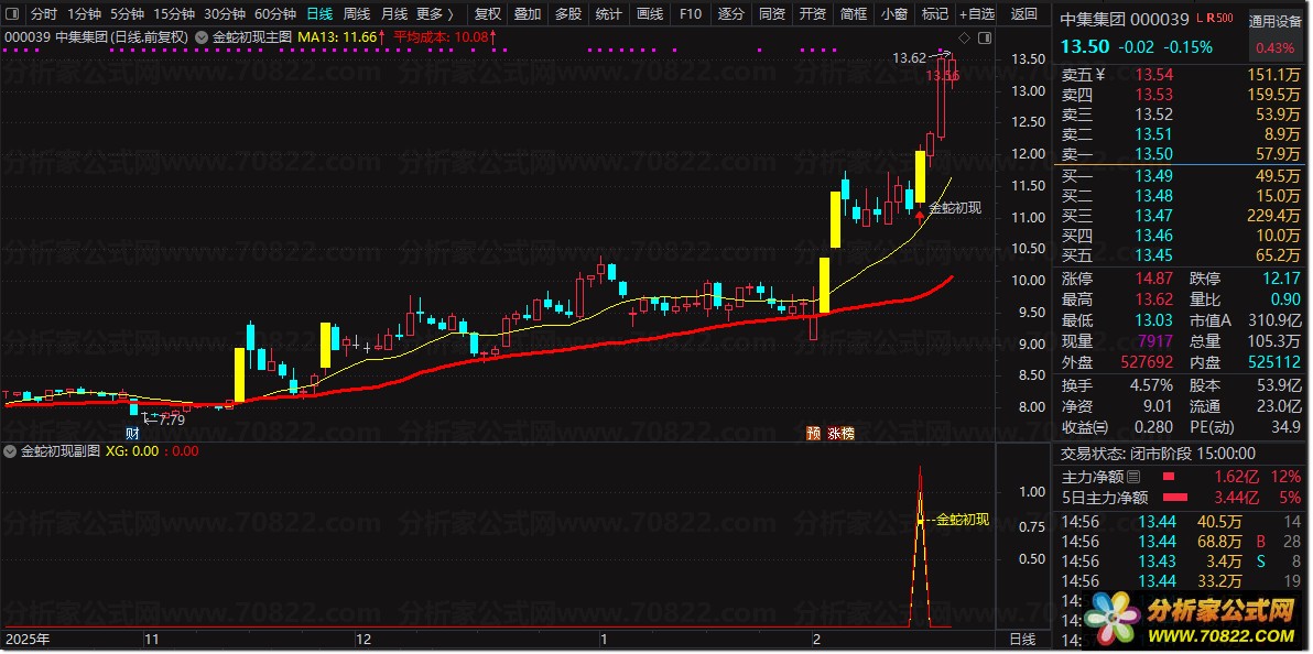 〖金蛇初现〗指标 包含主图副图及盘中选股功能 捕捉强势股启动信号 金蛇初现股票公式指标是一套专业的技术分析工具,完整包含1个主图指标、1个副图指标以及1个盘中选股功能。