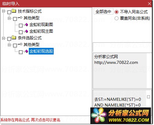 * 关于股票公式时间限制,如果在引入大智慧公式,交易师公式或者飞狐公式的时候,发现公式名称栏是空白的,这时候调整电脑时间到1997年,又能出现公式名称,并且能正常显示,可能是公式使用期限已过。