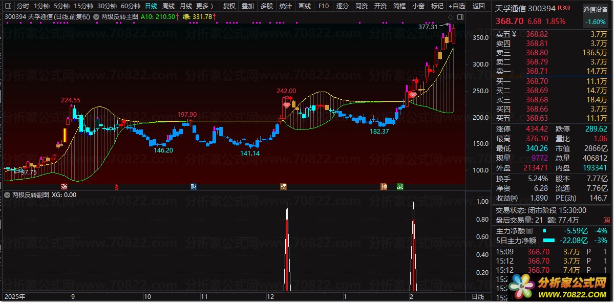 〖两级反转〗——抄底逃顶就靠它 场面局势发生扭转捕捉拐点! “两级反转”是一套集主图、副图与选股于一体的智能交易公式体系,专为识别价格在关键支撑/阻力区间发生强势反转而设计。主图通过多层EMA与标准差构建动态通道,结合K线着色与涨停标记,直观呈现趋势强弱与启动点;副图以简洁红柱提示“通道扩张突破”信号;选股公式则精准锁定当日满足“X2/X1比值由小于1.01转为大于1.01”的个股,即通道上下轨突然拉开、预示变盘启动的关键时刻。